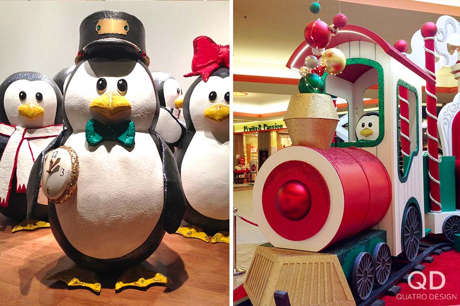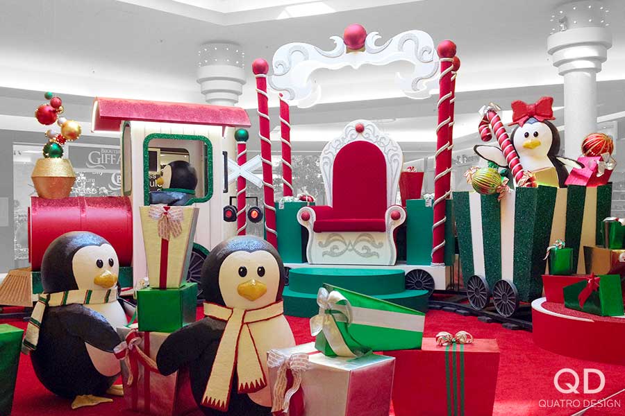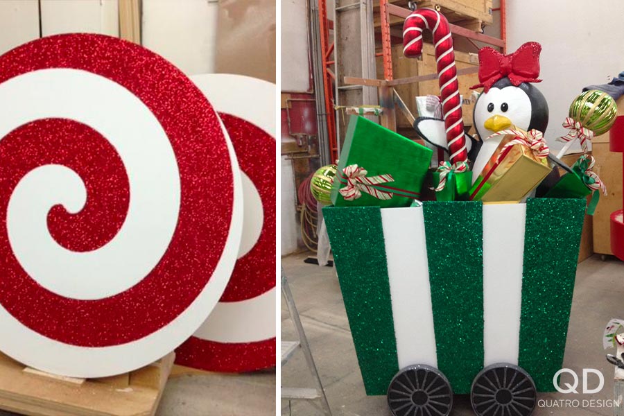 Nos concepteurs ont créé un royaume féérique dédié aux enfants. Un monde magique apparaît aussitôt que l’on aperçoit le trône du Père Noël sur son wagon, accompagné des amis pingouins en action. Chaque détail a été pensé pour une immersion complète dans une gare de Noël. La découpe numérique nous a permis d’ajouter des détails qui rendent le décor unique, comme des flocons, des pancartes de direction, des accessoires de train , un rail et des effets lumineux animés. Ce décor robuste est toujours installé chaque année, et nous y apportons les quelques retouches nécessaires afin qu’il reste impeccable.