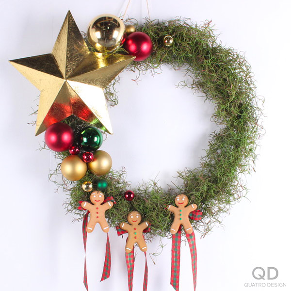Couronne de Noël d’allure classique dans les teintes traditionnelles, comprenant plusieurs ornements tels des boules, une étoile et des bonhommes en pain d’épice. Pour un usage intérieur.