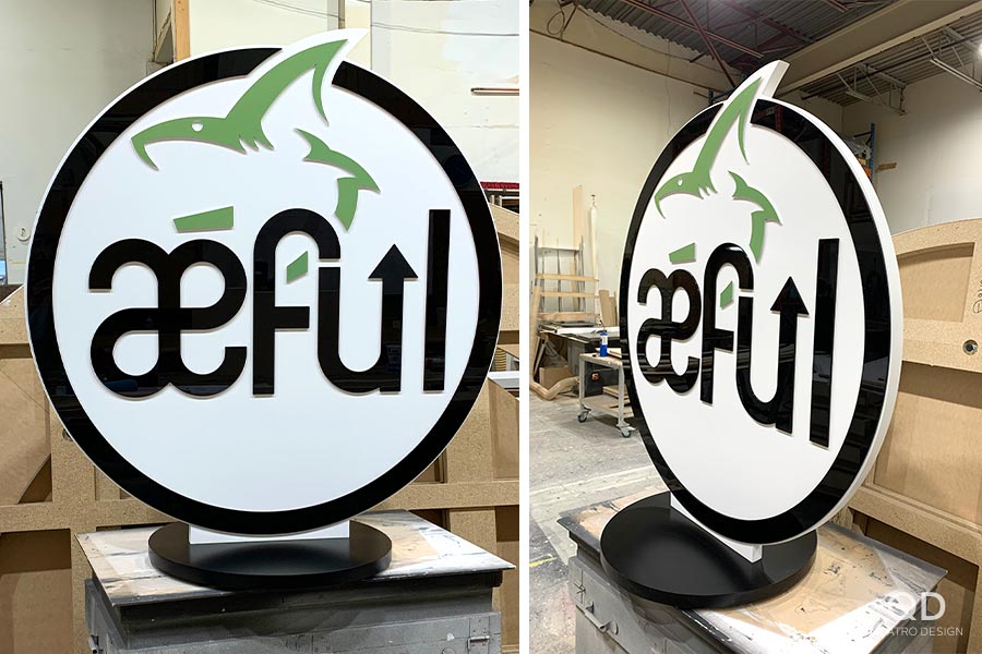Les enseignes sont souvent installées sur un mur ou suspendues, mais dans ce cas-ci, nous avons une enseigne sur pied! Ce logo géant d’environ 4pi x 4pi a été construit en bois avec des pièces en acrylique qui créent un relief intéressant.
