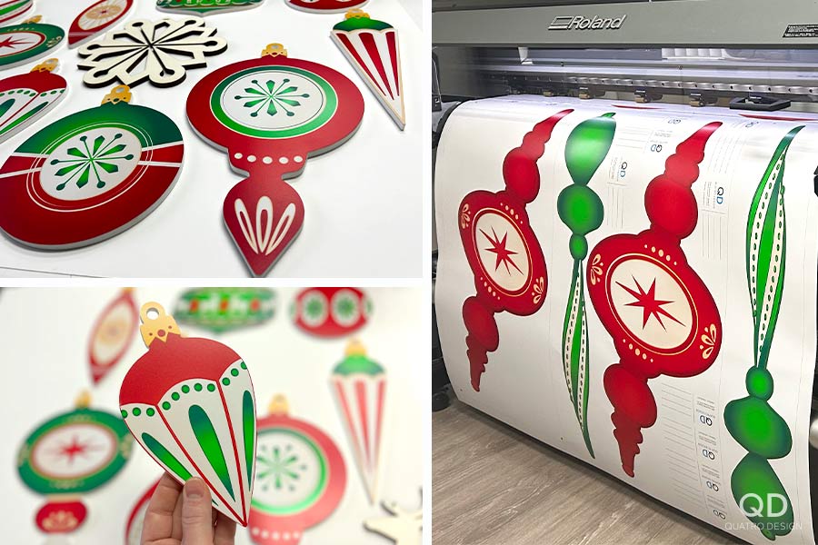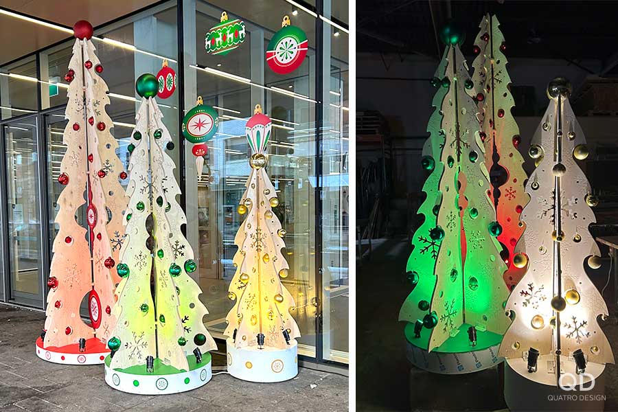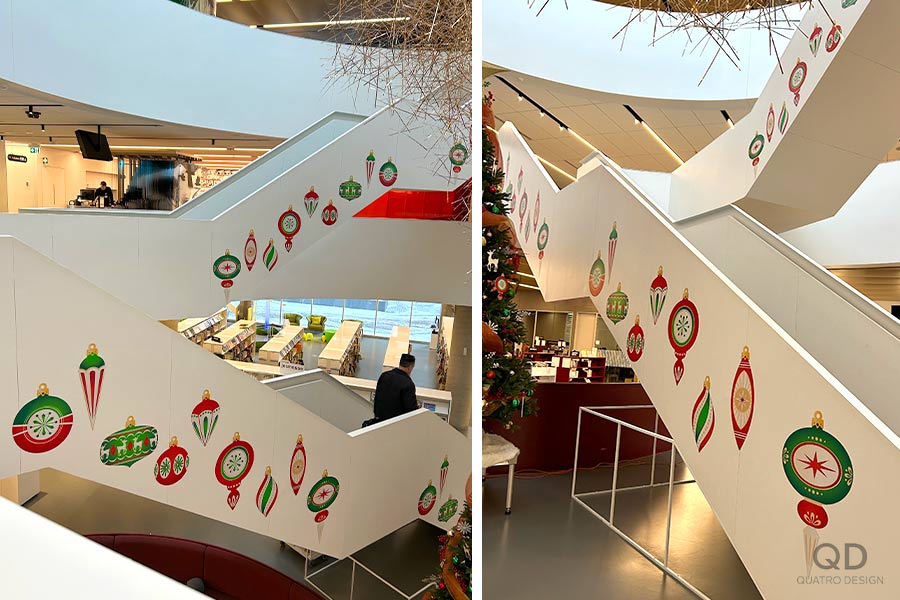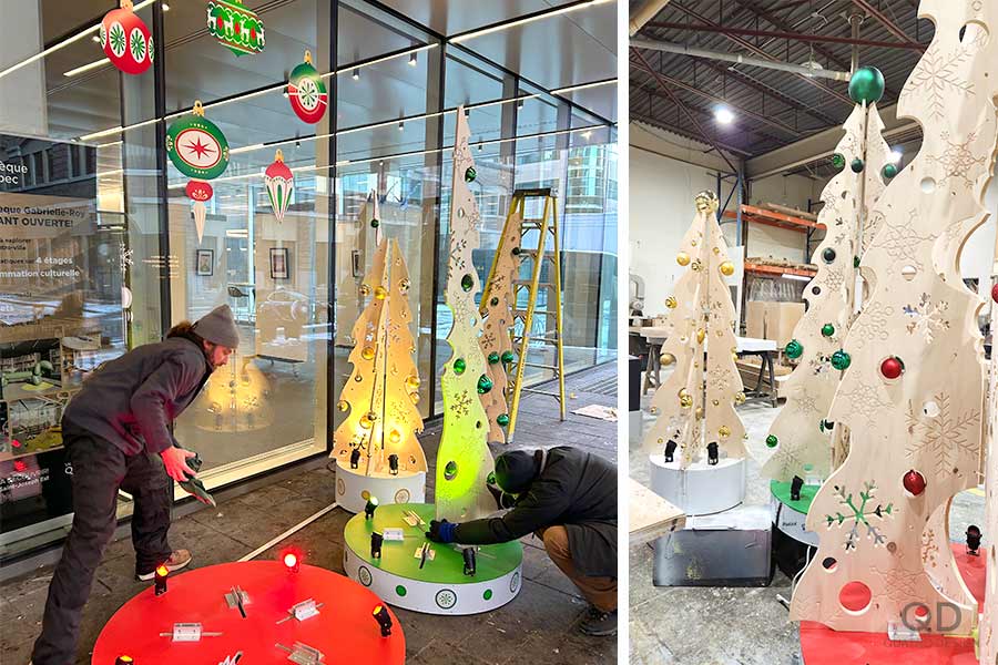 Ces décors ont été installés à la Bibliothèque Gabrielle-Roy de Québec. Vous pouvez admirer le trio de sapins illuminés à l’extérieur, ou encore la panoplie d’ornements décorant le grand escalier à l’intérieur. Fait intéressant : cet escalier est en métal, nous avons donc conçu les décorations avec un endos aimanté qui permet de les y installer ultra facilement!