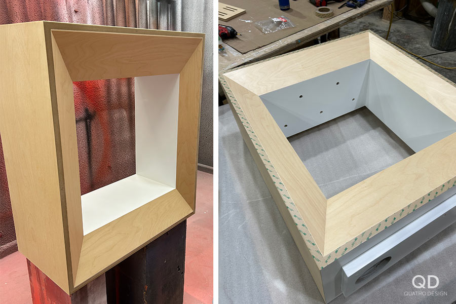 Voici un bon exemple de présentoirs adaptés au produit. Le placage de merisier, l’aluminium et la laque blanche donnent un côté épuré qui fait ressortir l’éclat des bijoux. Des verres sur charnières avec serrure permettent un accès facile par l’arrière.