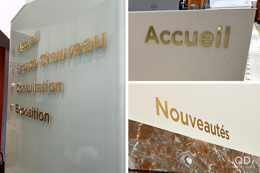 Voici une borne très élégante qui ajoute du charme au décor en plus d’orienter les visiteurs. Pour ce projet, les matériaux ont été choisis de façon à rendre la borne robuste et durable à travers le temps : acier, verre et lettrage au fini laiton découpé au laser. Un lettrage assorti est installé à d’autres emplacements de façon à bien identifier les lieux et créer une ambiance cohérente.
