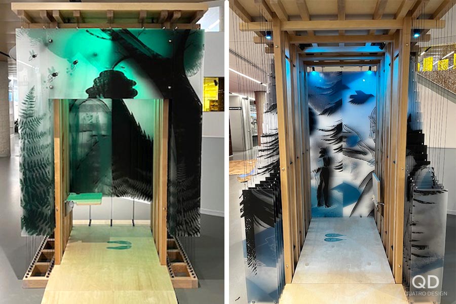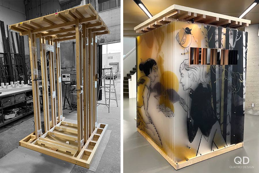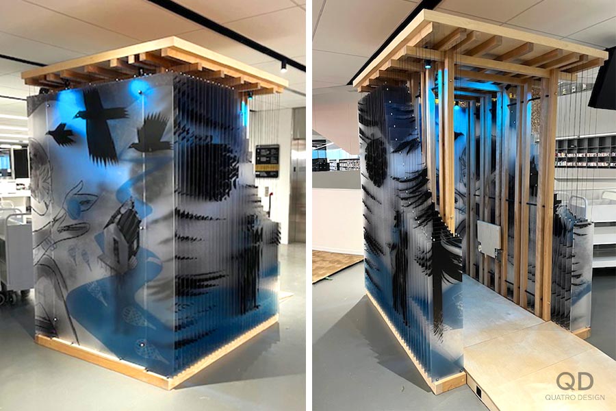 Nous avons réalisé ces quatre magnifiques stations pour le projet intitulé « Les têtes ailleurs », présenté dans la nouvelle bibliothèque Gabrielle-Roy. Nous avons travaillé étroitement avec les concepteurs pour bien intégrer les divers éléments techniques, interactifs et sonores lors de la fabrication. Ce projet fut un défi de précision; notre équipe a dû faire preuve d’une incroyable minutie pour installer tous les visuels en acrylique suspendus, afin que ceux-ci soient bien alignés et bien solides. Une oeuvre qu’il vaut la peine d’aller voir!