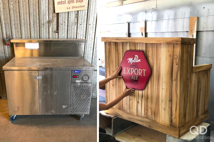Nous somme bien heureux de travailler à partir de produits fournis par le client! Nous avons réalisé cette façade de bar en cèdre massif patiné pour venir recouvrir un bar existant en acier inoxydable. Les côtés sont tous indépendants et peuvent être installés et retirés à la guise.