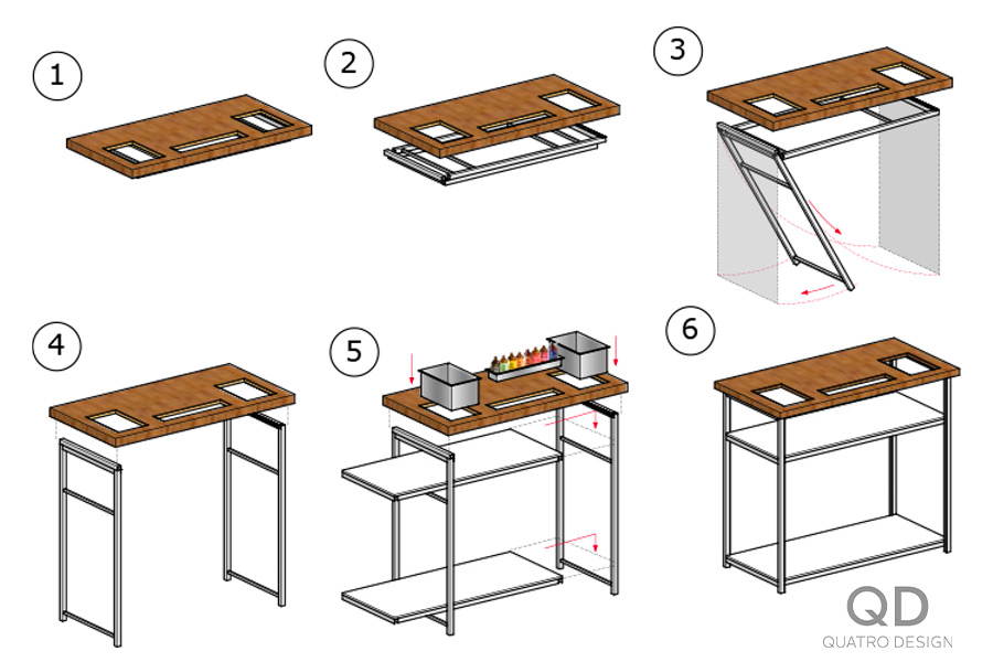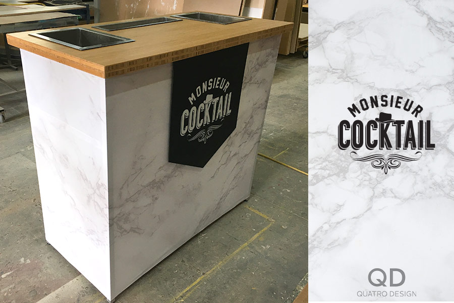 Un concept de comptoir compact et démontable qui est simple à transporter et à installer dans tous les événements. Grâce à la découpe numérique, nous avons pu tailler le dessus du comptoir de façon à intégrer à la perfection les éléments en acier inoxydable fournis par le client. La façade en tissu extensible lavable est également un bon moyen d’atteindre le look désiré tout en diminuant les coûts et en assurant un rangement facile.