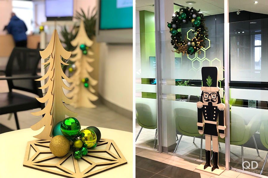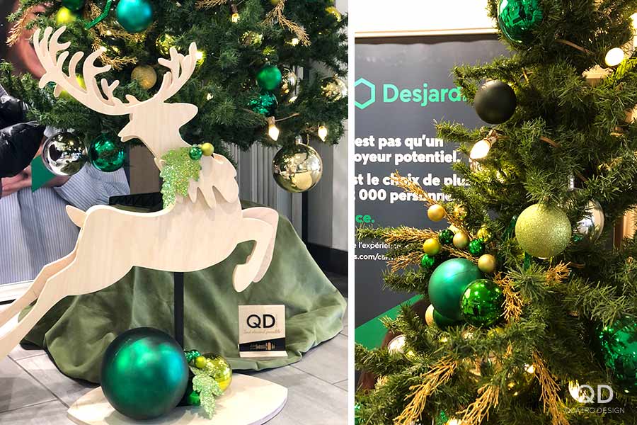 Le temps des fêtes, c’est notre dada! Peu importe l’environnement, nous concevrons un aménagement qui mettra en valeur votre commerce. Dans ce cas-ci, nous avons décoré les bureaux de la caisse Desjardins avec des découpes de vinyle, des éléments suspendus fabriqués sur mesure ainsi que des éléments en location comme les sapin en bois, le renne et le casse-noisettes.