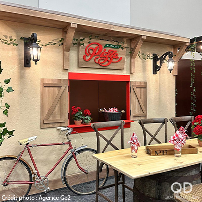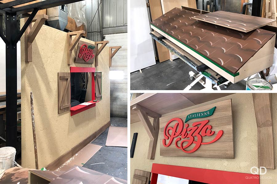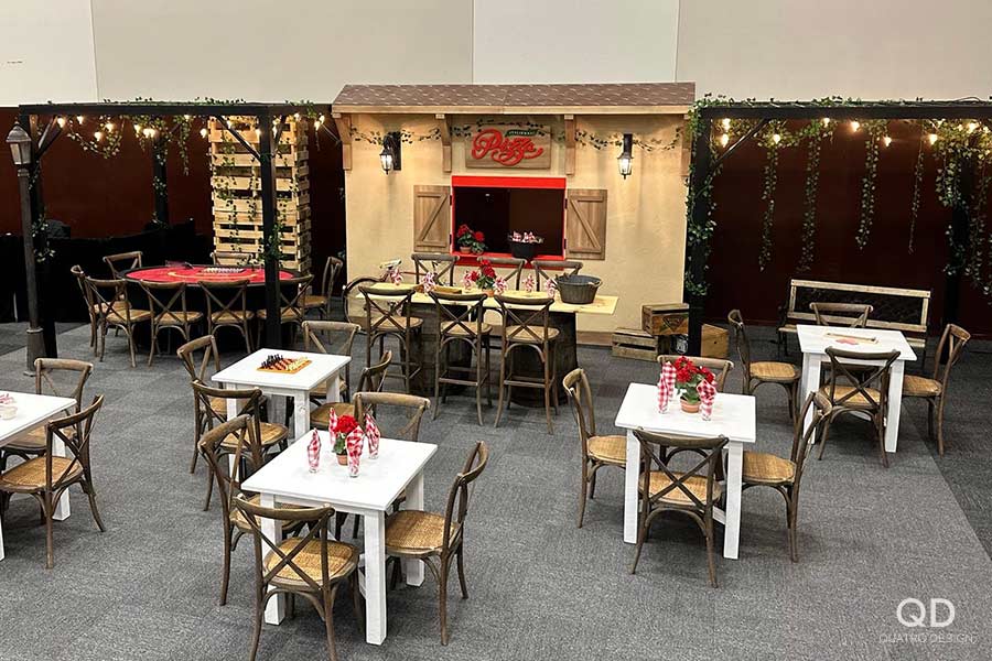 Nous avons été mandaté de concevoir et fabriquer une façade de café italien pour l’événement de notre client qui avait pour thème « soirée italienne ». Notre spécialiste en finition a réalisé des patines et faux-fini pour rendre le tout réaliste. Les deux lampes murales sont également fonctionnelles. Un décor simple mais efficace qui fait toute la différence en terme d’ambiance.