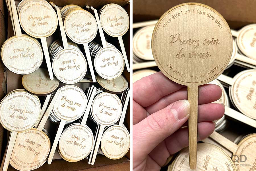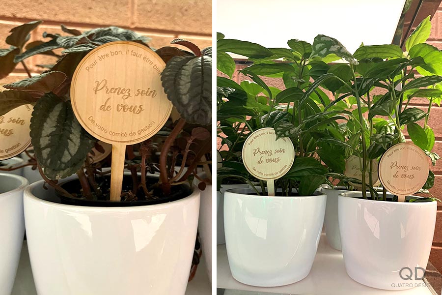 Le client souhaitait remercier ses d’employés en leur offrant chacun une petite plante. Nous avons donc conçu et produit 400 identificateurs de plantes en bois, qui ont été gravés et découpés à la machine laser. Ce genre de petit élément personnalisé est peu coûteux pour la magnifique touche qu’il apporte. Communiquez avec nous pour voir comment nous pouvons compléter votre projet.