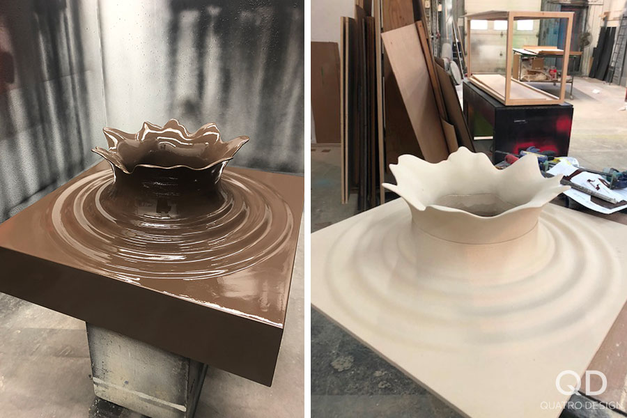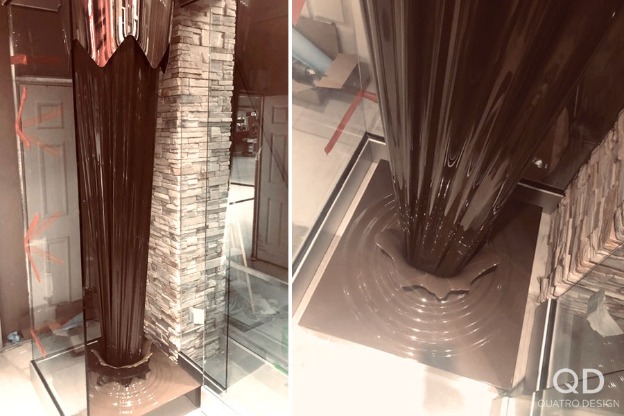 Nous nous sommes tournés vers la découpe 3D pour fabriquer l’éclaboussure de chocolat au sol, et notre spécialiste en finition s’est chargée de lui donner un fini réaliste. Les autres éléments du décor n’ont pas été réalisés par Quatro.