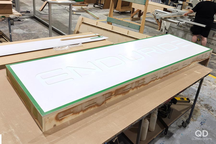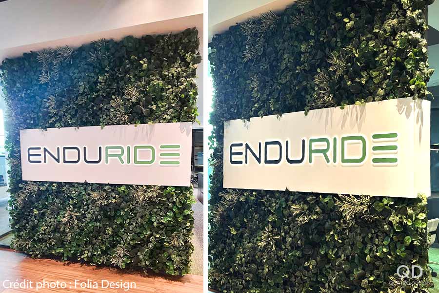 Comme le design de cette enseigne demandait que seule la tranche des lettres soit illuminée, nous avons fait des tests ainsi qu’un prototype pour s’assurer que le résultat final soit parfait. Ce genre de projet nous rend très fier; un défi complexe que nos experts ont relevé avec brio! Le mur en verdure a été réalisé par Folia Design.