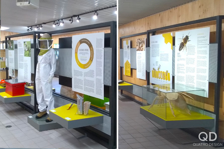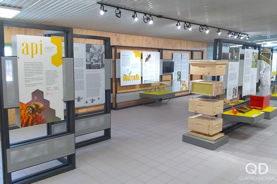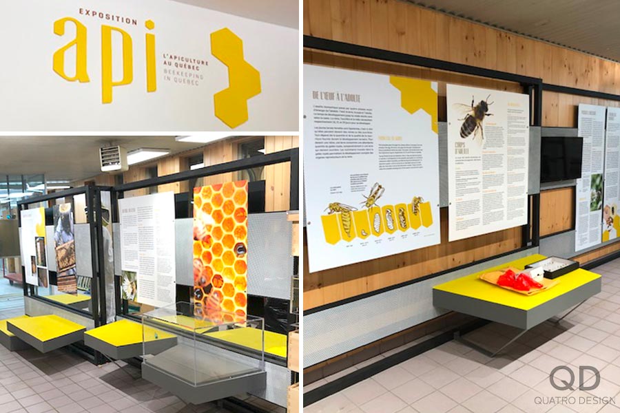 Encore une fois, Quatro exporte son talent à l’extérieur de Québec. Dans cette exposition installée à Mirabel, nous avons réalisé le lettrage en acrylique et en vinyle ainsi que les divers modules. Les panneaux de métal perforé et le vinyle jaune appliqué sur les tablettes ajoutent vraiment une touche amusante au mobilier. Nous aimons travailler avec différents matériaux pour en apprendre toujours plus sur les milles et une possibilités!