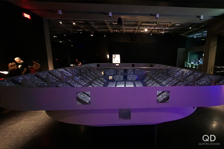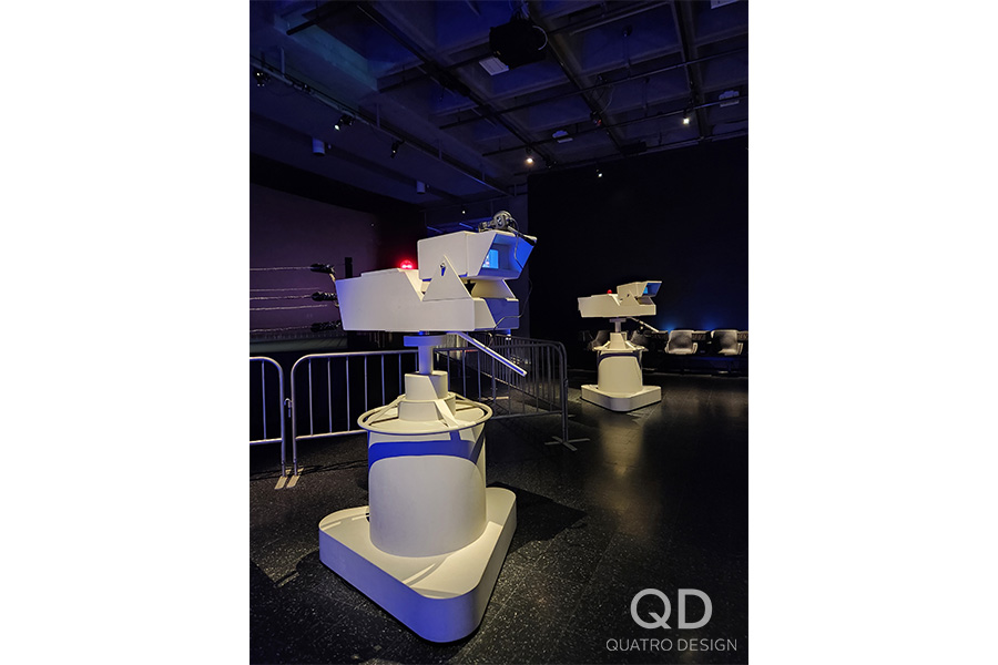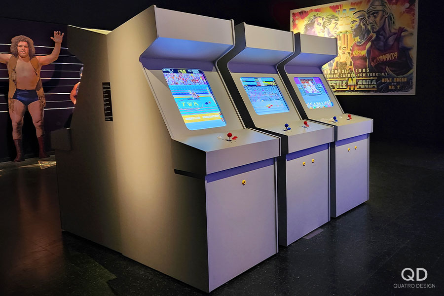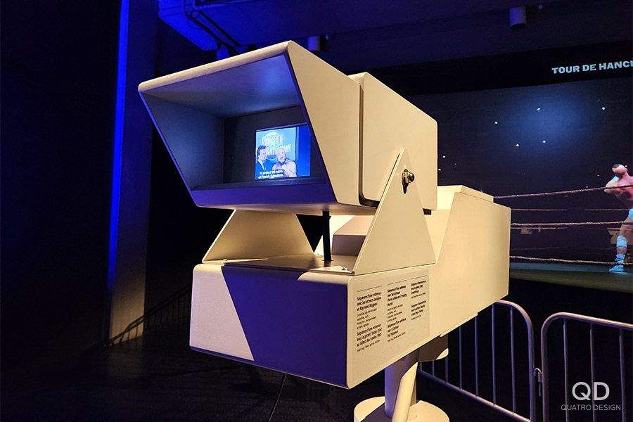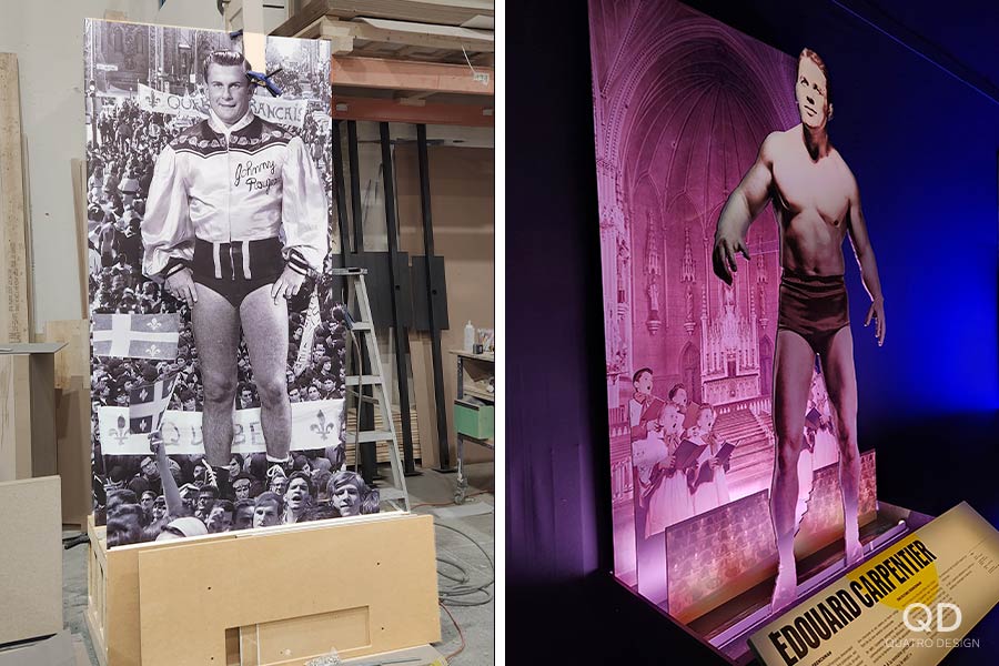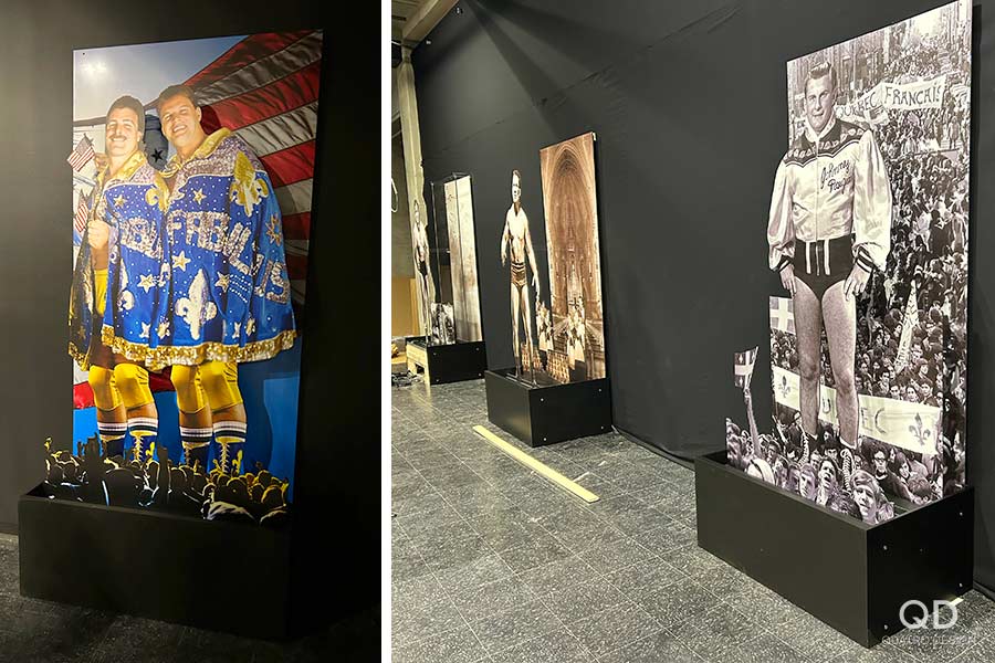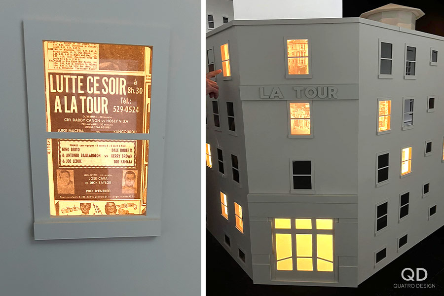 Nous avons réalisé plusieurs éléments pour l’exposition « Lutte. Le Québec dans l’arène » présentée par le Musée de la civilisation. Des maquettes grand format de théâtres reconnus (colisée, forum, tour), des reproductions de caméras de tournage et de bancs avec mini écrans de télévision, des arcades pour y jouer à des jeux de lutte et des grands personnages représentant les titans de la scène du combat. Pour la plupart de ces éléments de décor, nous avons dû faire des tests et des prototypes pour s’assurer d’avoir le produit final le plus réaliste possible. Il fallait également travailler étroitement avec notre client en vue de bien intégrer ses appareils techniques. Nous adorons ce genre de défi qui nous permet de réaliser des projets hors de l’ordinaire!