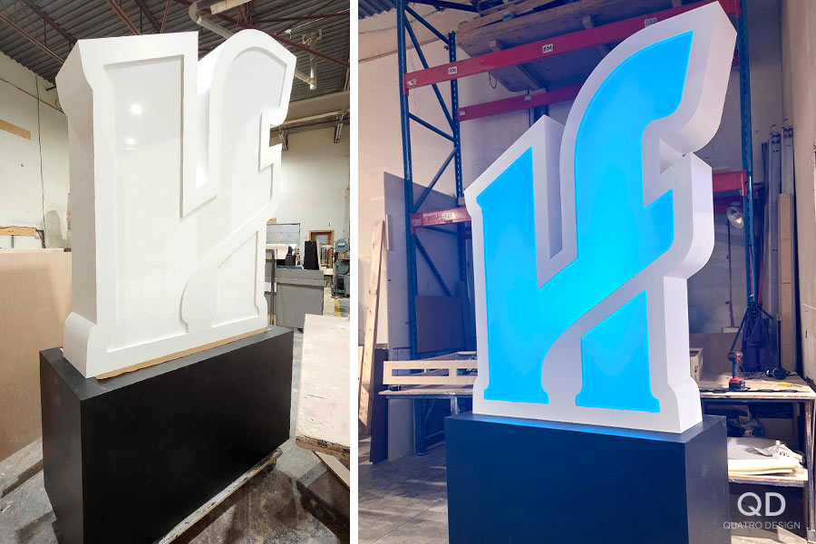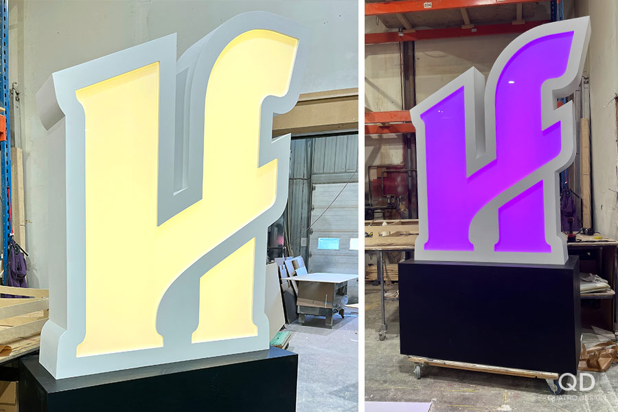 Voici un gigantesque « H » de 6 pieds de hauteur, monté sur une base de 3 pieds. Cet élément de décor est le fruit d’un travail méticuleux de fabrication. Chaque détail a été pensé pour allier esthétisme, robustesse et fonctionnalité. Les rubans DELs RGB intégrés permettent de changer les couleurs à volonté, offrant une flexibilité visuelle en fonction de l’ambiance de chaque performance. Imaginez l’impact d’un tel élément sur votre événement : un centre d’attention lumineux et captivant qui élève l’énergie des présentateurs et des interprètes!