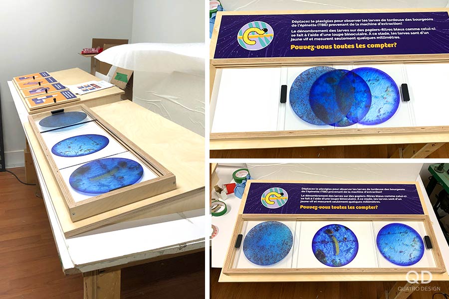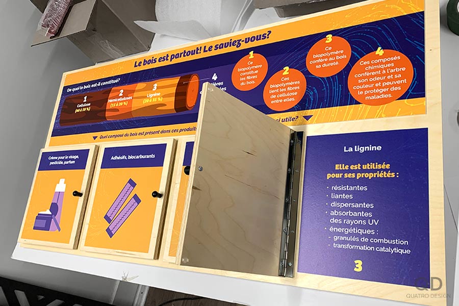Ces modules interactifs ont été réalisés dans le cadre du Carrefour Forêts qui se déroulait au Centre des congrès de Québec. De petites portes à ouvrir et des panneaux à glisser; quoi de mieux que de faire participer les visiteurs pour leur faire apprendre de nouvelles informations!
