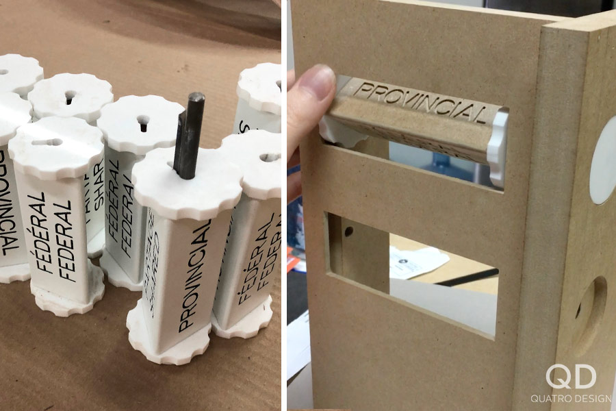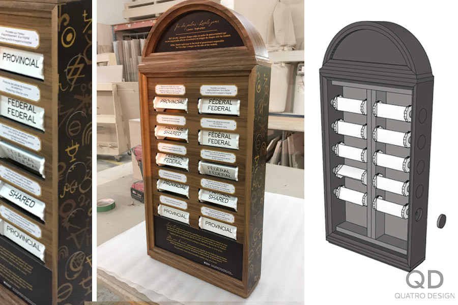 Nos concepteurs sont excellents pour mettre au point de petits mécanismes tout en gardant en tête l’aspect esthétique. Ce petit jeu consiste à indiquer si un dossier relève du gouvernement provincial ou fédéral ou des deux; si les rondelles sur le côté du module s’alignent avec le reste de l’image, c’est qu’on a la bonne réponse!
