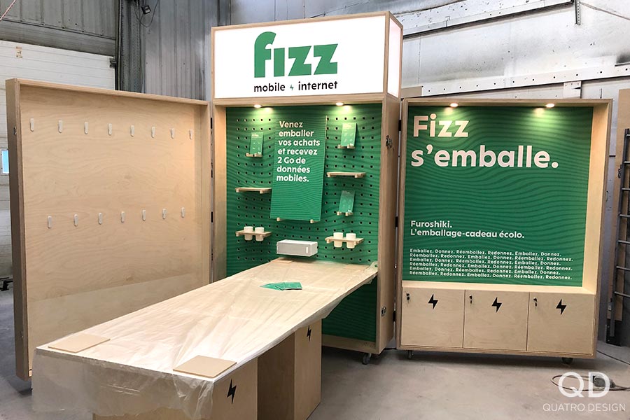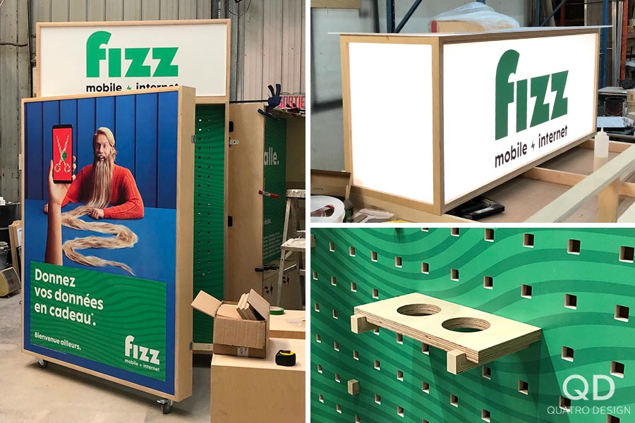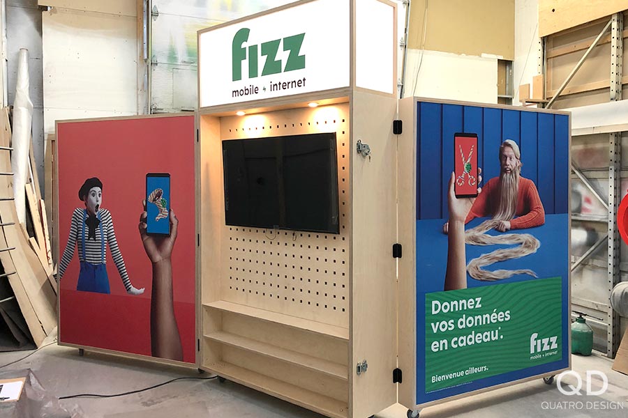 Quel beau défi! Le client désirait un kiosque « pop-up » sur roulettes dépliable en 3 sections et qui peut se refermer pour être verrouillé. Le kiosque comprend des espaces de rangements de différentes natures y pour accrocher et déposer divers éléments. Il est également surmonté d’une enseigne lumineuse. Nous avons produit toutes les découpes et affiches en vinyle autocollant. Chez Quatro, nous vous offrons des projets clés en main à la hauteur de vos attentes, et même au-delà!
