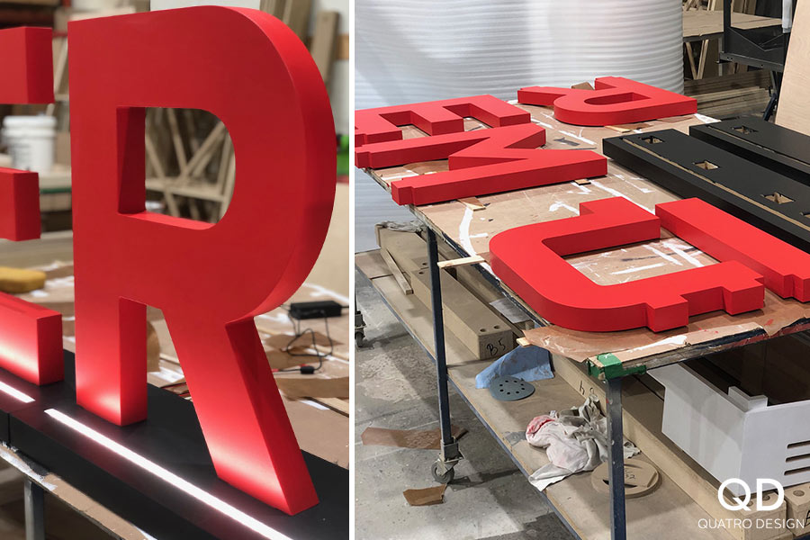 Le lettrage n’a pas toujours à avoir une taille démesurée pour avoir un gros impact. Dans ce cas-ci, les lettres de 2 pi de hauteur et de 2 po d’épaisseur ont un look ultra chic grâce à la bande DEL encastrée dans la base qui éclaire le tout. Elles sont également démontables de la base par un système de bouteilles, pour une installation et un rangement faciles.