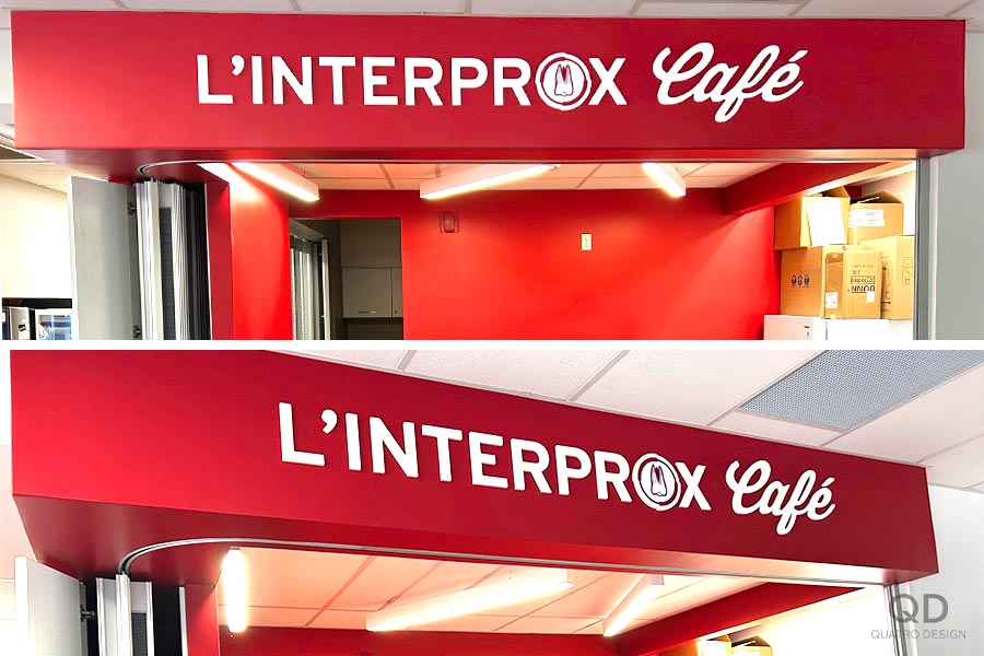 Les découpes de lettrage sont un moyen facile et efficace de mettre en valeur un lieu ou un commerce. Le logo de l’Interprox Café de l’Université Laval fut découpé en acrylique blanc, et le visuel de la dent sur le « O » fut ajouté avec une impression sur vinyle autocollant.