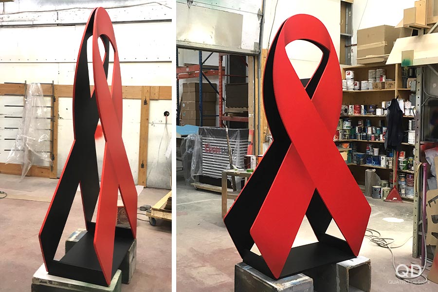 Nous avons réalisé ce ruban rouge géant qui vise à attirer l’attention des visiteurs lors d’événements de dépistage de MIELS-Québec. Le fait que les deux côtés soient en angle avec l’arrière peint noir donne un effet d’ombrage pour accentuer le 3D. Peu lourd, il est facile à déplacer et à transporter à divers endroits.