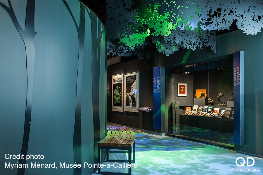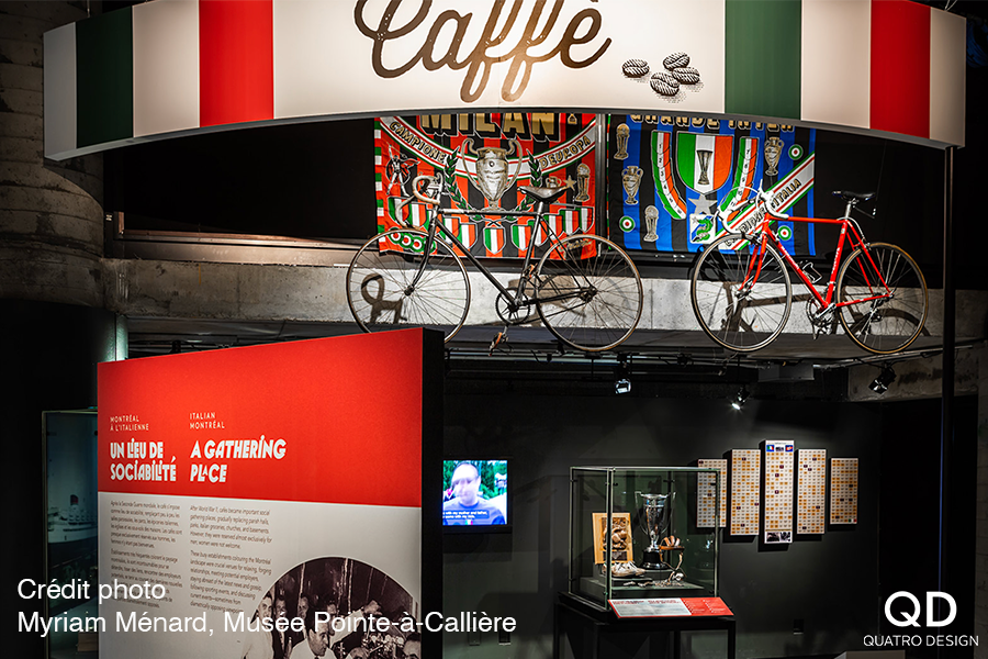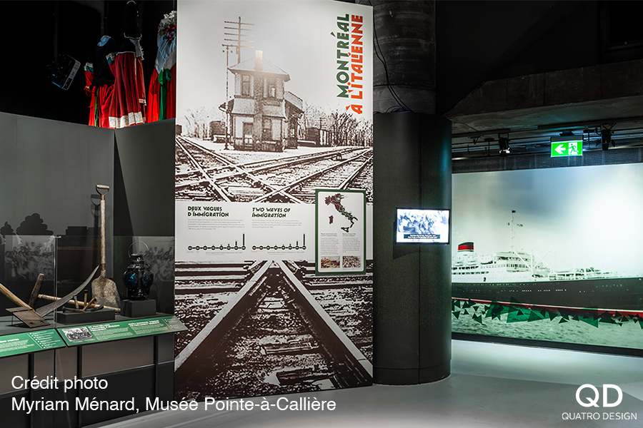 Présentée au Musée Pointe-à-Callière, Montréal à l’italienne rassemble différents objets, illustrations et contenus historiques au sujet des premiers immigrants italiens à Montréal. Quatro Design a eu l’opportunité de contribuer à la conception de cette exposition et en a réalisé la fabrication intégrale. En plus des cloisons, vitrines et podiums, nous avons entre autres reproduit une entrée de maison du quartier italien et réalisé un module interactif permettant d’éclairer une région de l’Italie et sa vitrine correspondante lorsqu’on appuie sur des pédales.