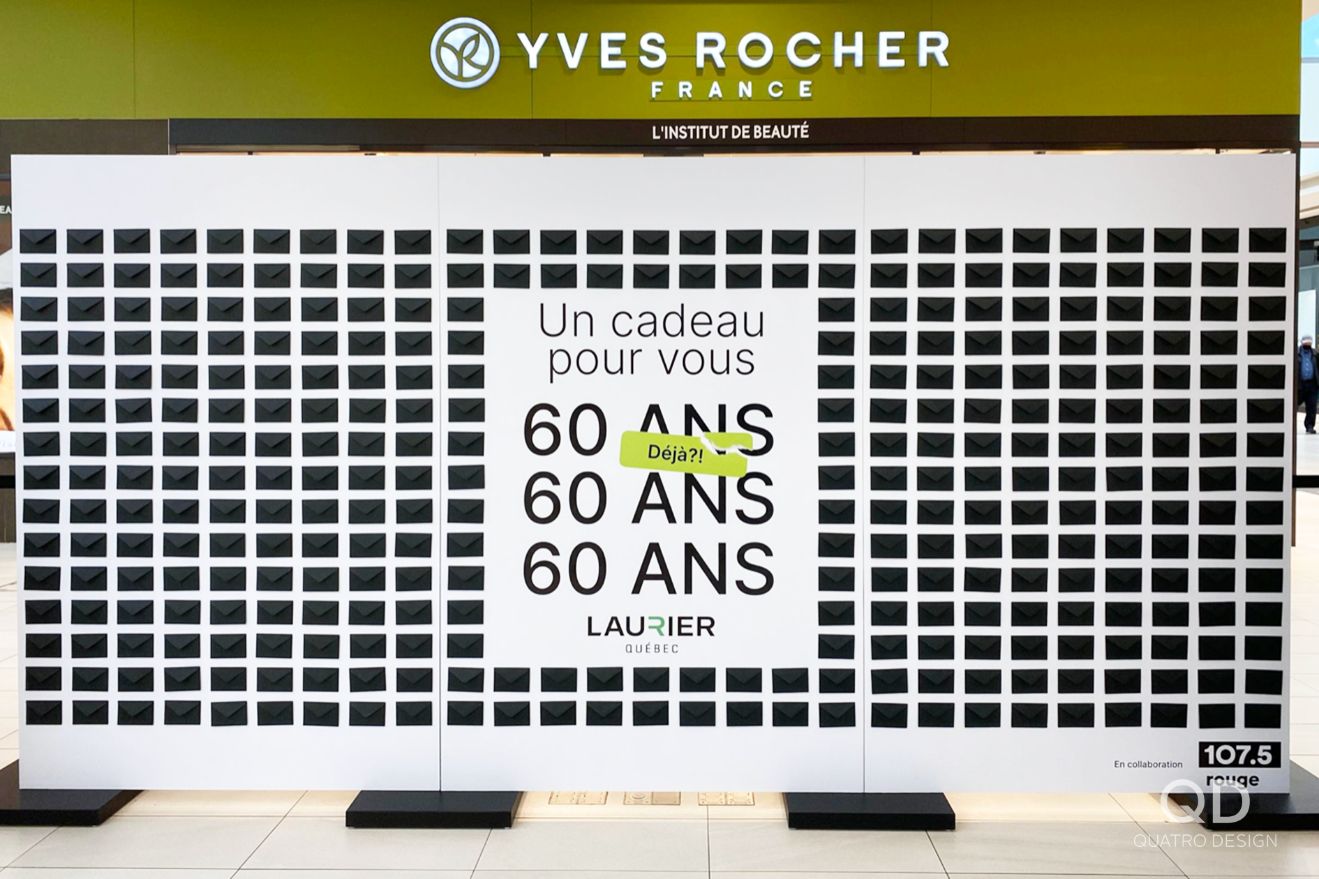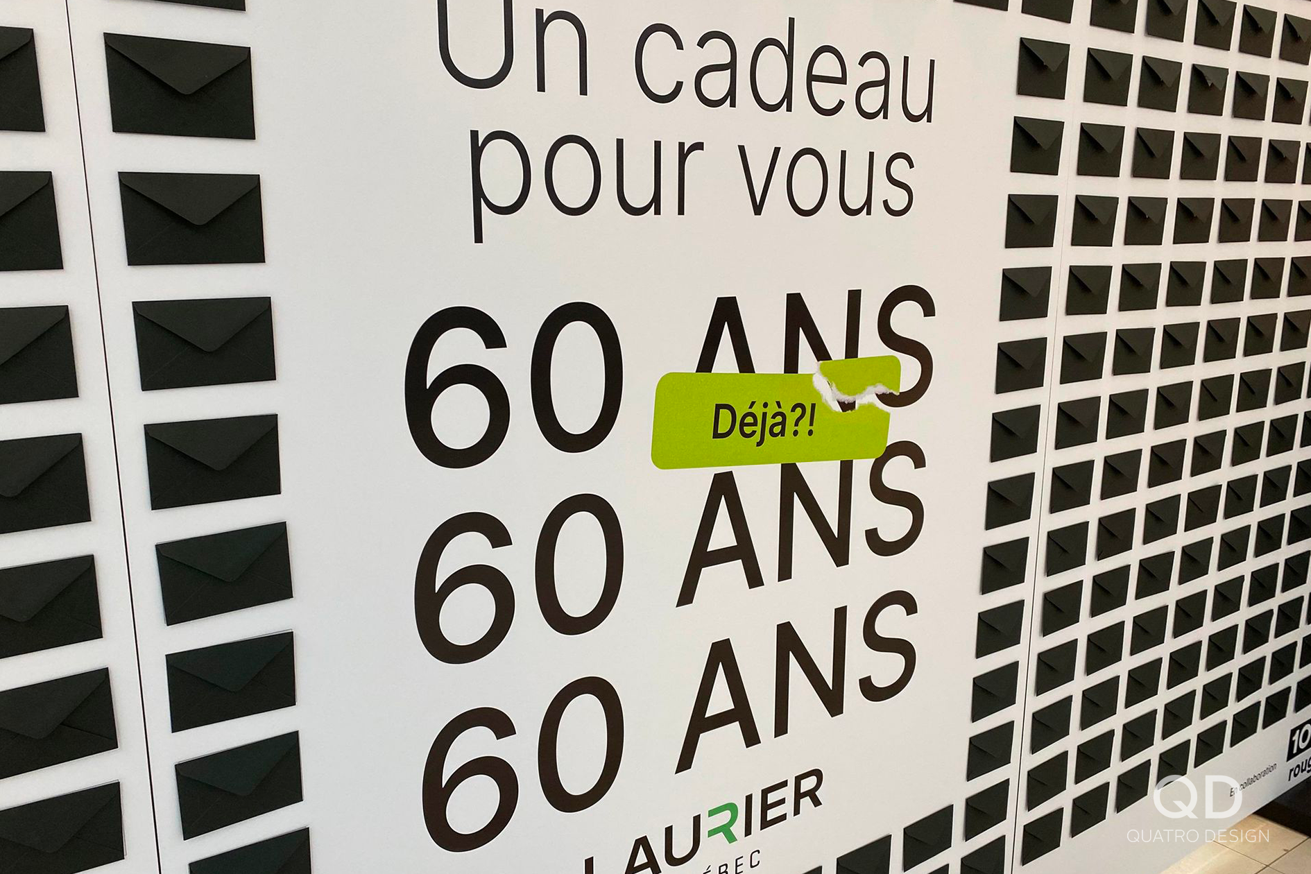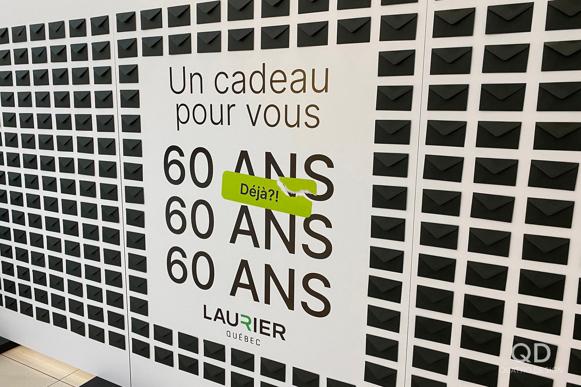 Pour souligner les 60 ans de Laurier Québec, Bell Média désirait avoir un mur autoportant afin de venir y coller des enveloppes contenant des cartes-cadeaux. Un projet simple et efficace qui a pu être réalisé rapidement pour cet événement qui ne durait qu’une fin de semaine.
