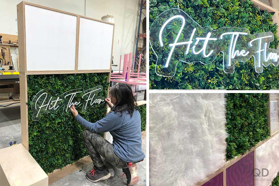 Quatro a conçu ce magnifique décor qui a servi de photobooth durant les événements de danse Hit The Floor. Sa particularité est qu’il peut être modifié à travers le temps : les caissons carrés et rectangulaires sont interchangeables entre eux pour composer une nouvelle forme, et le contenu des boitiers lumineux peux être changé selon le goût du moment! L’enseigne au ruban néon, qui donne beaucoup de punch, est une de nos nouvelles spécialités!