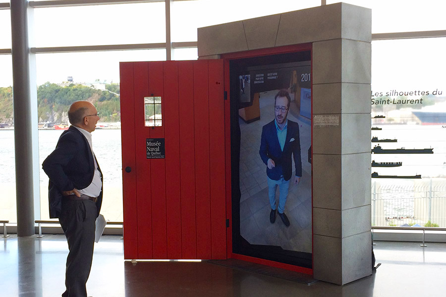 Les portes virtuelles. Un concept inspiré d’Europe, mais qui est arrivé à Québec! Quel plaisir de réaliser deux fausses portes ancestrales pour l’intégration de téléviseurs grand format. Les portes sont placées à deux endroits différents, et il est possible de communiquer d’une à l’autre grâce à une technologie de pointe. Une expérience virtuelle unique, où plaisir, découvertes et technologies se rencontrent. Un projet orchestré par Simbioz et le Musée Naval de Québec.