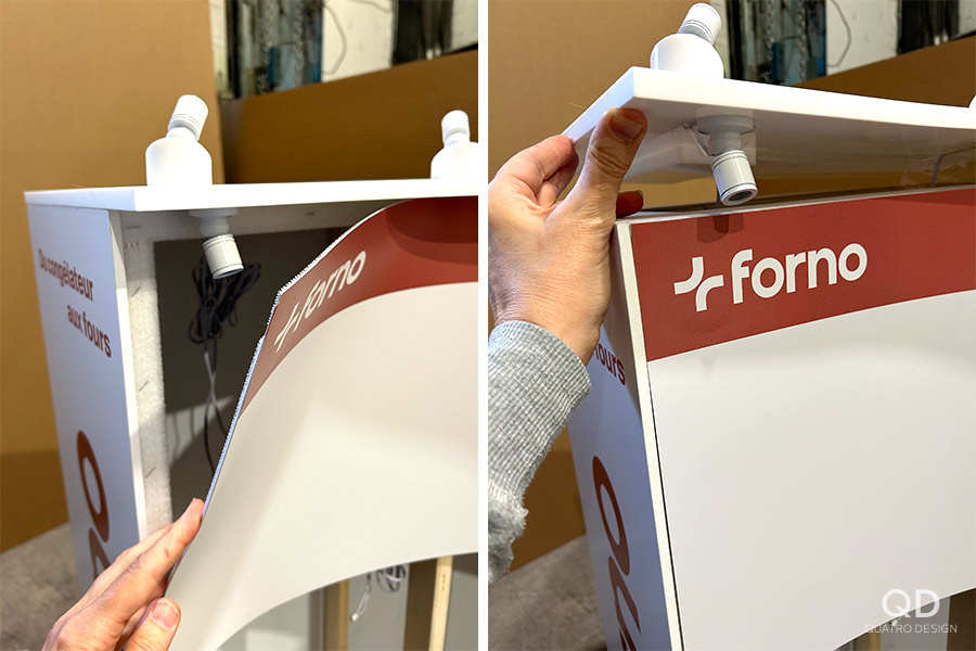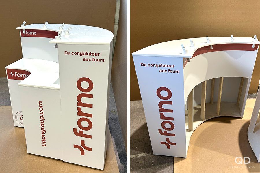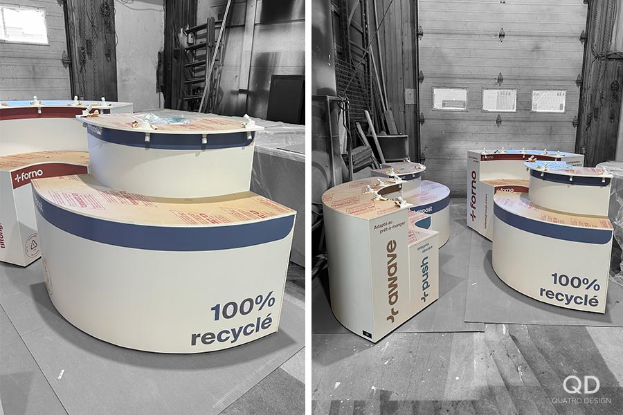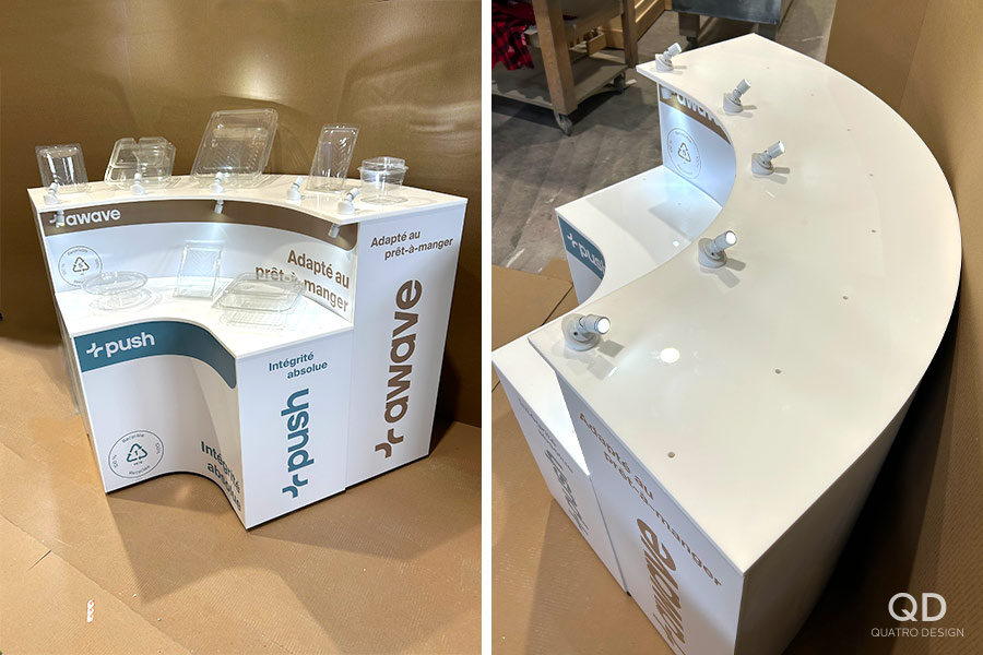 Ces podiums servent à présenter les produits du client, soit des contenants en plastique pour la nourriture. Nous avons intégré de discrets petits projecteurs pour mettre en valeur les éléments. Nous avons également produit les visuels grâce à notre imprimante et découpeuse vinyle. Le client nous a également mandaté de construire des caisses de transport pour les différents présentoirs.