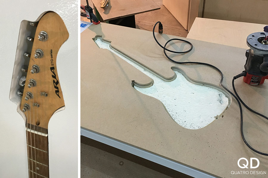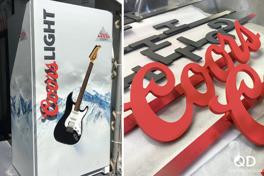 Notre mandat était d’encastrer une guitare dans un réfrigérateur et de remplacer la poignée existante par une poignée « Coors Light » personnalisée. Nous aimons ce style de projets éclatés, car nous adorons nous casser la tête pour trouver des solutions afin que le résultat final soit impeccable. « Rock on! », comme on dit!