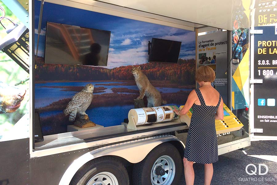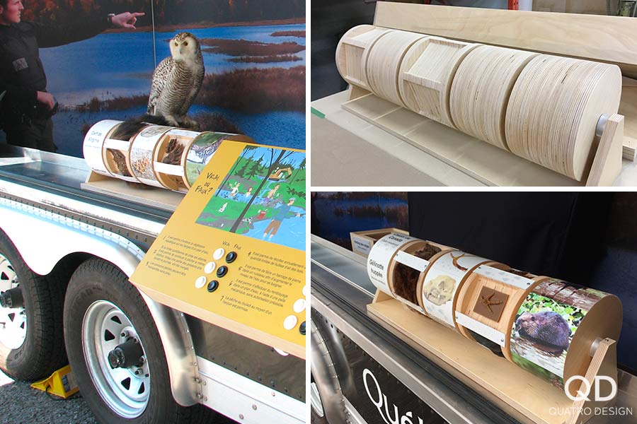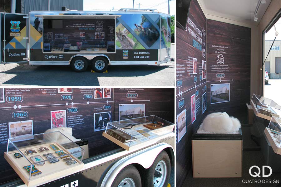Un projet sur mesure où nous avons aménagé la remorque pour la transformer en mini exposition itinérante. Nous avons réalisé les socles, les vitrines et les interactifs, et nous avons installé les tapis et les panneaux graphiques.
