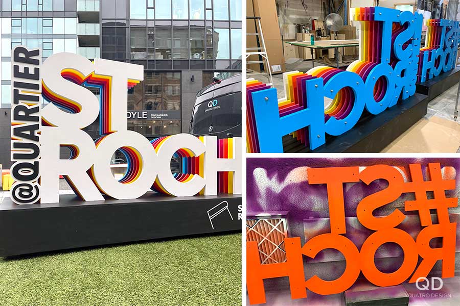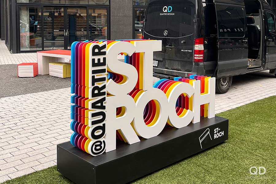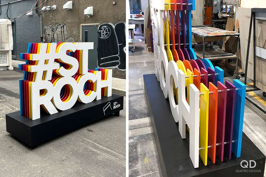 Ces deux photobooths extérieurs ont notamment été utilisé dans le quartier St-Roch pendant l’événement « St-Roch XP ». Le logo a été découpé numériquement en plusieurs épaisseurs, chacune d’une couleur différente, qui sont espacées et fixées ensemble à l’aide de tiges de métal. L’effet arc-en-ciel de ce design est très attirant pour l’oeil.