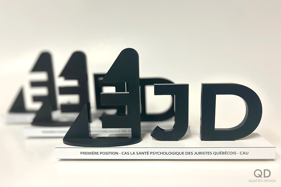 Voici de jolis trophées en acrylique découpés avec notre machine laser. Celle-ci nous permet d’usiner une foule de matériaux minces aux différents finis. Nous pouvons également personnaliser chaque trophée en y gravant la catégorie et le nom du gagnant.