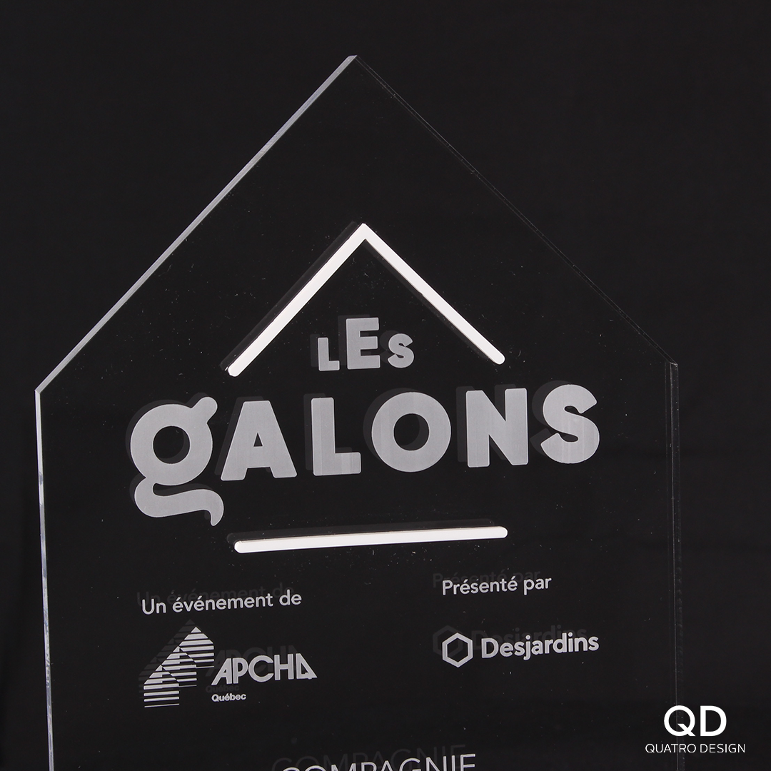 L’APCHQ nous a confié le mandat de réaliser un trophée pour leur nouveau projet « Les galons » créé en 2020, qui met en valeur les réalisations entrepreneuriales des entreprises membres de l’association. Grâce à la découpe laser, nous pouvons graver de fines écritures sur une panoplie de matériaux.