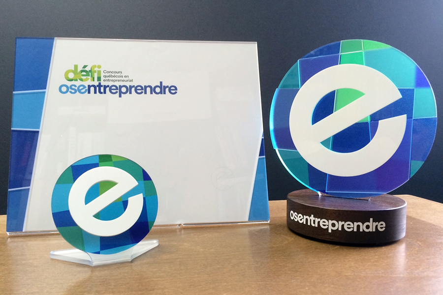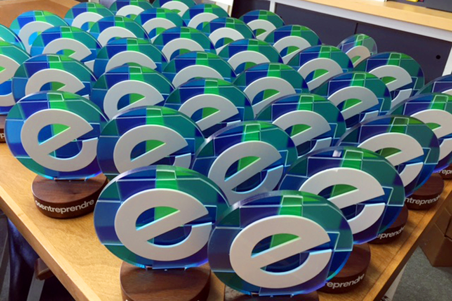 Quel beau projet que de concevoir et de réaliser des trophées pour récompenser les entrepreneurs! Notre mandat consistait à créer des prix uniques au design accrocheur qui allaient se distinguer au premier coup d’œil. Prestige et modernité : voilà ce qui nous a guidé vers l’utilisation de l’acrylique, du bois massif et d’un effet 3D. Bravo à tous les gagnants!