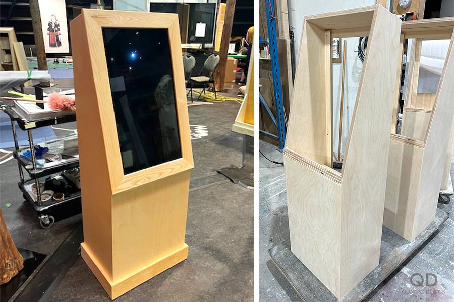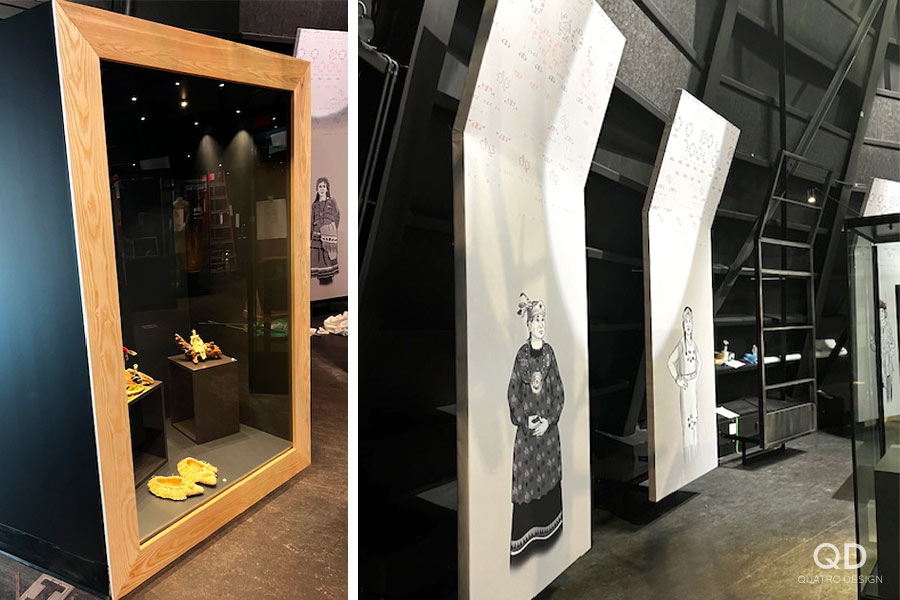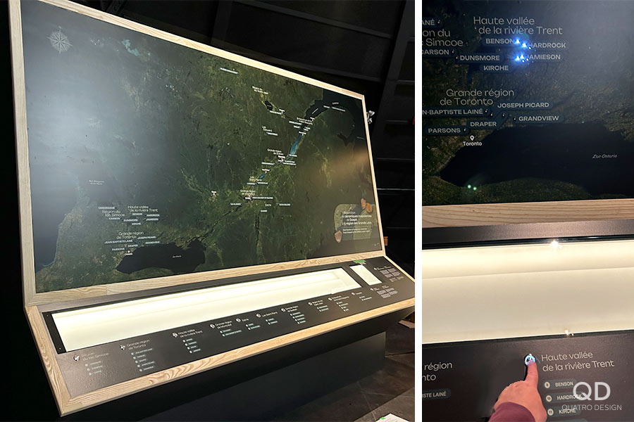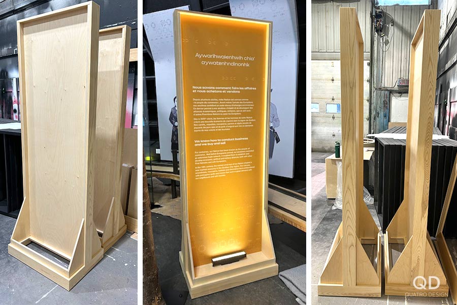 Nous sommes fiers d’avoir travaillé à la fabrication de cette exposition permanente qui se retrouve au Musée huron-wendat de Wendake. Ce projet comportait quelques défis de taille; notamment un énorme module montrant la carte du Québec avec des régions qui s’allument lorsqu’on appuie sur des boutons. Nous avons également réalisé des structures de métal recouvertes de tissu imprimé qui semblent flotter, un espace régie avec une grande vitrine de présentation, et plusieurs modules en contreplaqué et en bois massif.